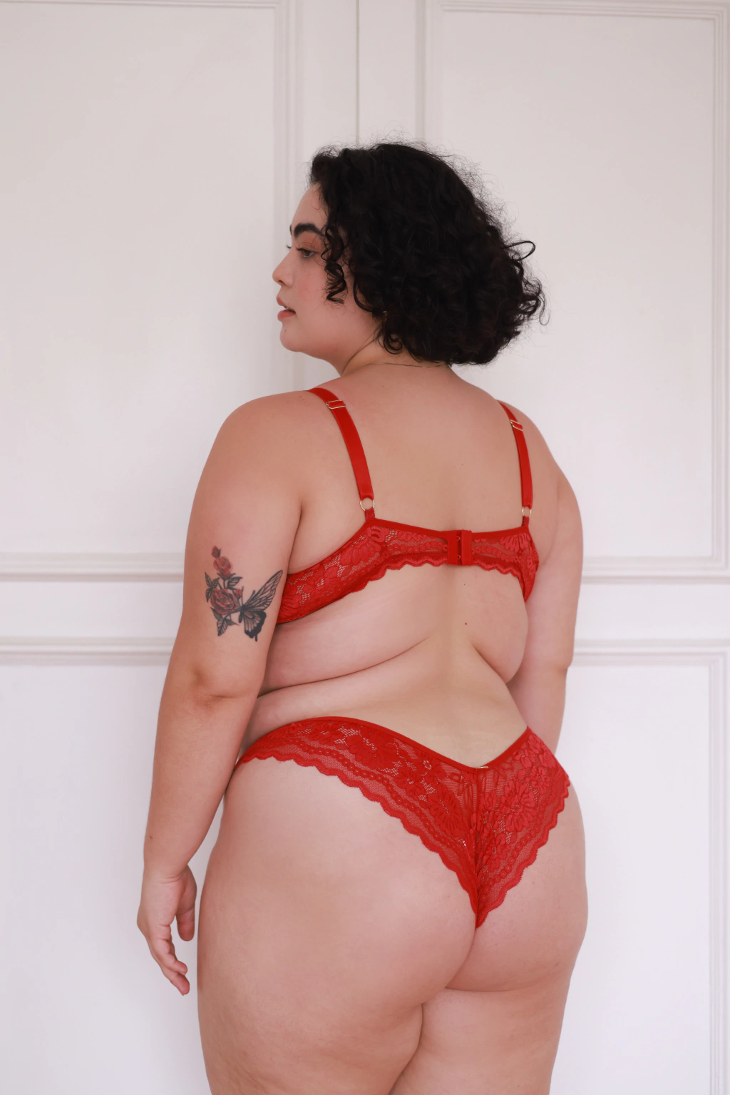 Exalte sua beleza e sensualidade com este deslumbrante conjunto plus size todo em renda floral vermelha. Com detalhes elegantes e delicados, ele é perfeito para proporcionar conforto e sofisticação. As alças ajustáveis oferecem maior sustentação e conforto, valorizando seu busto com segurança. Modela naturalmente sem abrir mão do estilo. A calcinha confeccionada em renda macia, garante um caimento perfeito e um toque sensual. Possui fecho nas costas para um ajuste sob medida e maior praticidade. Ideal para momentos especiais ou para se sentir incrível no dia a dia!